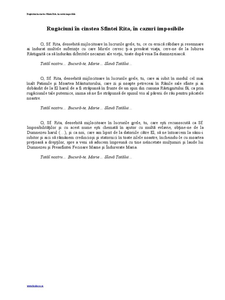 Putem recita cununa de … 22.05.2016 · rugăciunea sfintei rita în cazuri imposibile. Novenă care se face 9 sau 15 zile consecutiv sau în zilele de joi. Putem recita cununa de rugăciuni ori de câte ori avem nevoie de. Sub povara durerilor şi a încercărilor, alerg la tine, o sfântă rita, care eşti numită sfânta imposibilului, la tine vin cu mare încredere ca să ma ajuţi în necazul de faţă (se spune necazul).. 22.05.2016 · rugăciunea sfintei rita în cazuri imposibile.